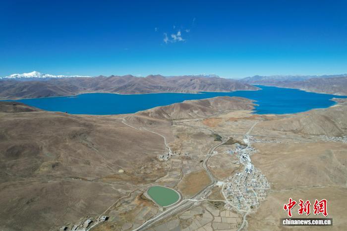 10月25日,西藏山南羊卓雍錯(cuò)東北岸東拉鄉(xiāng)沿線風(fēng)光,遠(yuǎn)處雪山皚皚。(無(wú)人機(jī)畫(huà)面)中新社記者 江飛波 攝
