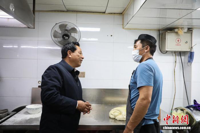 圖為馬世功(左)在西寧市一家拉面館與經(jīng)營人員交流。馬銘言 攝