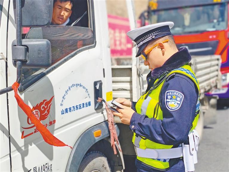 拉薩交警在國(guó)道沿線開展路檢路查工作。