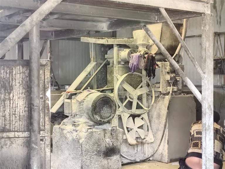4月10日11時許,記者跟隨城關區(qū)市場監(jiān)管局執(zhí)法人員穿過米瓊日隧道,來到一處由幾間簡易鐵皮房圍建而成的院落。該院落臨近米瓊日山路,從外面看,任誰也想不到這里是一家制粉廠。院落左側有一間不足60平方米的加工室,室內(nèi)一個寫有“粉料攪拌機”字樣的儀器上,布滿了白色污垢。