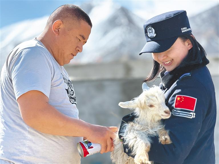 圖為日土邊境派出所民警李泉嫻(右)幫助村民給小羊羔噴標(biāo)記。 本報(bào)記者 張宇 本報(bào)通訊員 任博 攝