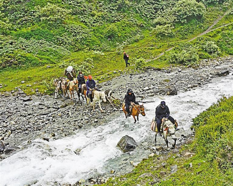 圖為貢當(dāng)邊境派出所民警騎馬護送村民及物資前往冬蟲夏草采挖區(qū)。西藏日報記者 張宇 通訊員 季馨 攝