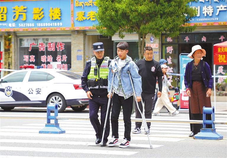 圖為林芝市公安民警幫助行動(dòng)有困難的考生順利到達(dá)考場。