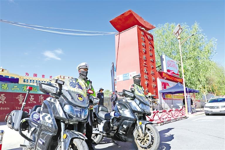 圖為日喀則市公安交警在考場外執(zhí)勤,為考生營造安靜有序的考試環(huán)境。 本報(bào)記者 彭琦 攝