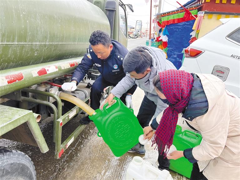 每年10月后,阿里地區(qū)便進入漫長的冬季。巴嘎鄉(xiāng)崗莎村因塔爾欽曲河道結冰,當?shù)厝罕娚钣盟掷щy。塔爾欽邊境派出所組建黨員服務小分隊,每周都會按時調用水車從水井抽水,為轄區(qū)居民集中送水。