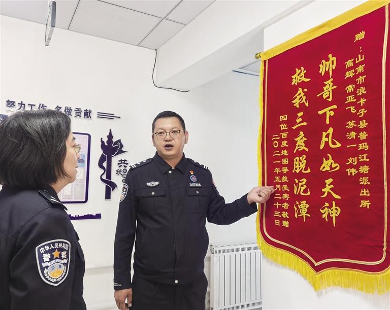 “帥哥下凡如天神,救我三度脫泥潭!”如果錦旗有生命,憑借這兩行字,它無疑會(huì)成為最引人注目的那一個(gè)。這面特別的錦旗存放在山南市邊境管理支隊(duì)普瑪江塘邊境派出所的榮譽(yù)室里。2021年5月,普瑪江塘邊境派出所接到求助電話,稱4名游客駕車前往崗布冰川被困沼澤,亟待救援。接警后,民警迅速到達(dá)現(xiàn)場(chǎng)進(jìn)行救援。游客脫險(xiǎn)后千恩萬謝,與民警互留電話。民警叮囑他們趕緊離開,不要再去冰川了。然而走了還不到5分鐘,民警又接到電話,稱他們?cè)俅务{車陷入泥沼動(dòng)彈不得。警車原路返回,進(jìn)行救援。然而民警剛離開10分鐘,再次接到了游客電話:“警官,非常不好意思,我們又陷進(jìn)去了還得麻煩你們?cè)倩貋硪惶恕!庇谑牵@面“救我三度脫泥潭”的錦旗便誕生了。