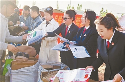 圖為林周縣人民法院工作人員為群眾發(fā)放“生態(tài)法治禮包”。西藏日報記者 拉巴桑姆攝