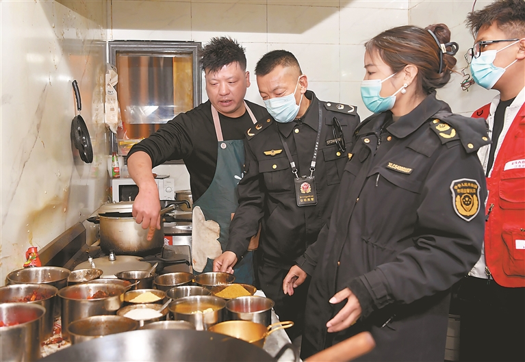 圖為拉薩市城關(guān)區(qū)市場(chǎng)監(jiān)督管理局金珠西路市場(chǎng)監(jiān)督所執(zhí)法人員對(duì)飯店后廚環(huán)境衛(wèi)生進(jìn)行檢查。記者 索朗旺久 攝