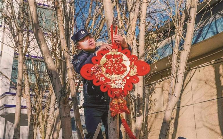 夜幕四合,一天的走訪慰問與便民服務圓滿結束,派出所營區(qū)里迎來了一場屬于邊關衛(wèi)士的新春“家宴”?!皝韥韥恚畎咽?!把中國結掛高點,更顯喜慶!”教導員楊曦淙踩著凳子懸掛中國結,新警吳措多杰在一旁穩(wěn)穩(wěn)扶著梯子;另一邊,民警們三五成群,貼春聯(lián)、掛彩燈,將營區(qū)裝點得喜氣洋洋、年味十足。