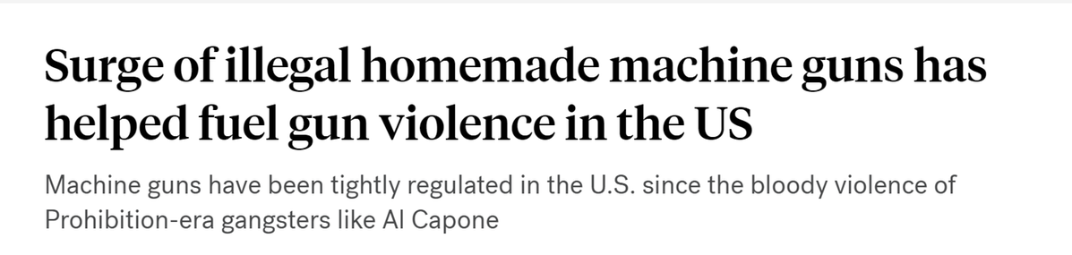 據(jù)報(bào)道,由于3D打印制作或在線購(gòu)買(mǎi)的小型金屬或塑料零件的驚人增長(zhǎng),全美各地近年來(lái)都出現(xiàn)了使用經(jīng)改裝的全自動(dòng)槍支制造的槍擊事件。盡管針對(duì)機(jī)槍的禁令可以追溯到上世紀(jì)二三十年代的禁酒令時(shí)期,但有關(guān)部門(mén)表示,格洛克開(kāi)關(guān)、連發(fā)阻鐵等改裝零件的大量增加,使得普通人能夠?qū)⒑戏ǖ陌胱詣?dòng)槍支改裝得更加危險(xiǎn),進(jìn)而助長(zhǎng)了槍支暴力。