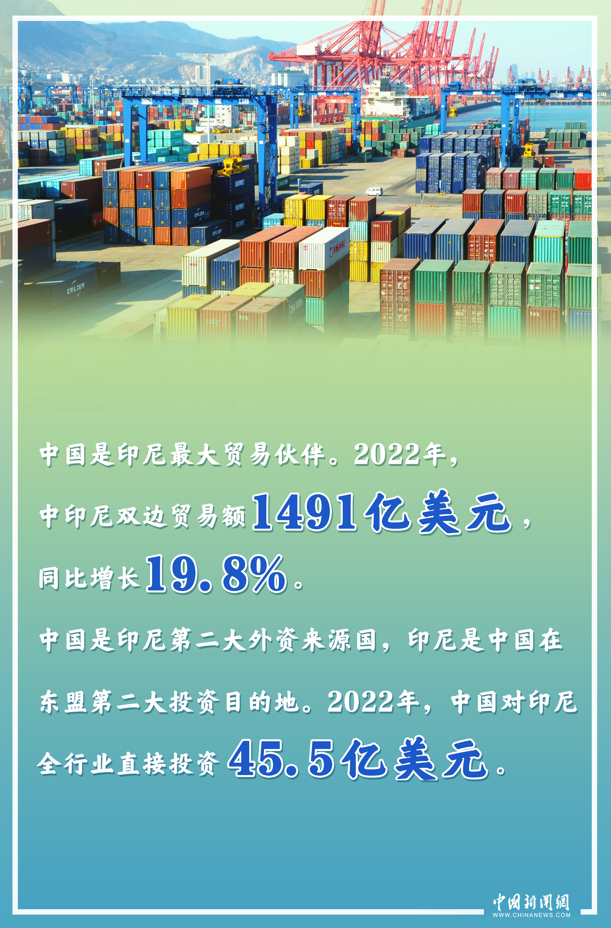 中國是印尼最大貿易伙伴。2022年,中印尼雙邊貿易額1491億美元,同比增長19.8%。中國也是印尼第二大外資來源國,印尼是中國在東盟第二大投資目的地。2022年,中國對印尼全行業(yè)直接投資45.5億美元。