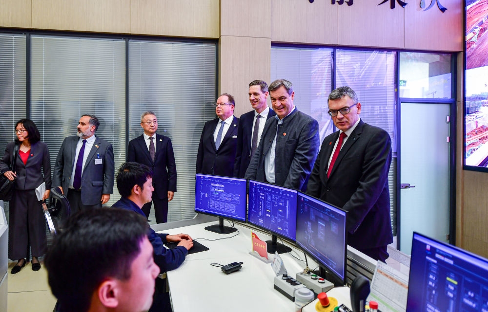 德國巴伐利亞州州長索德爾(右二)一行來到中德合作的磁懸浮成都試驗線列車運控中心參觀。新華社記者張超群攝