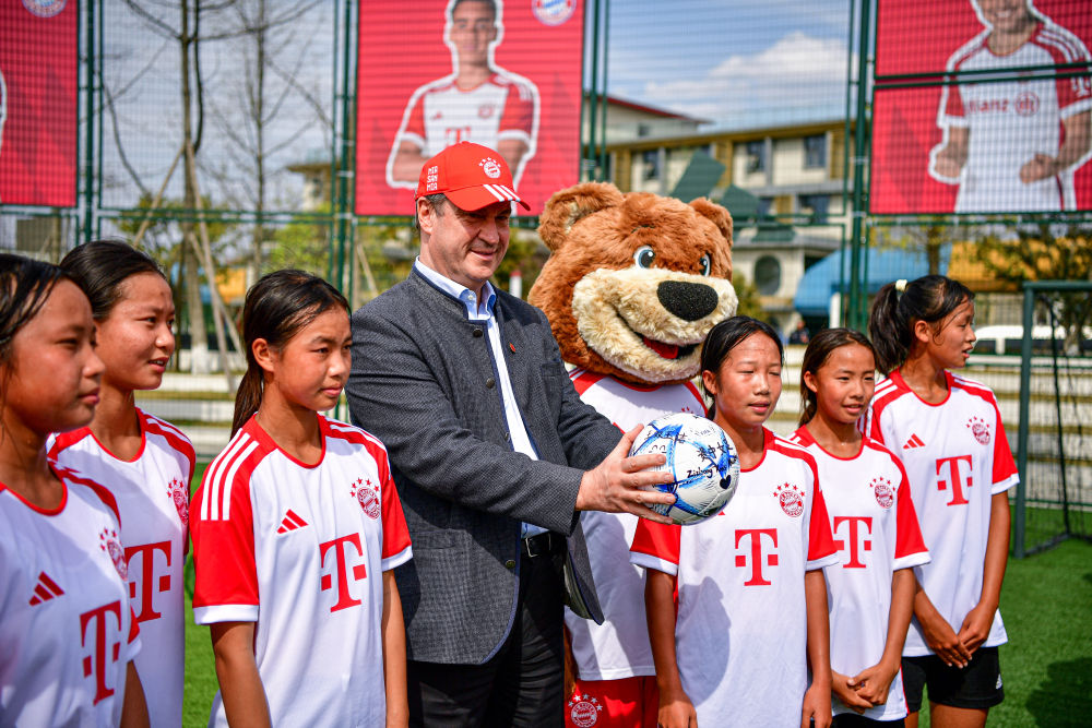 德國巴伐利亞州州長索德爾(左四)在位于成都市武侯區(qū)的阿迪達斯20號體育公園觀摩了一場中國少年女子足球隊的訓(xùn)練賽。新華社記者張超群攝