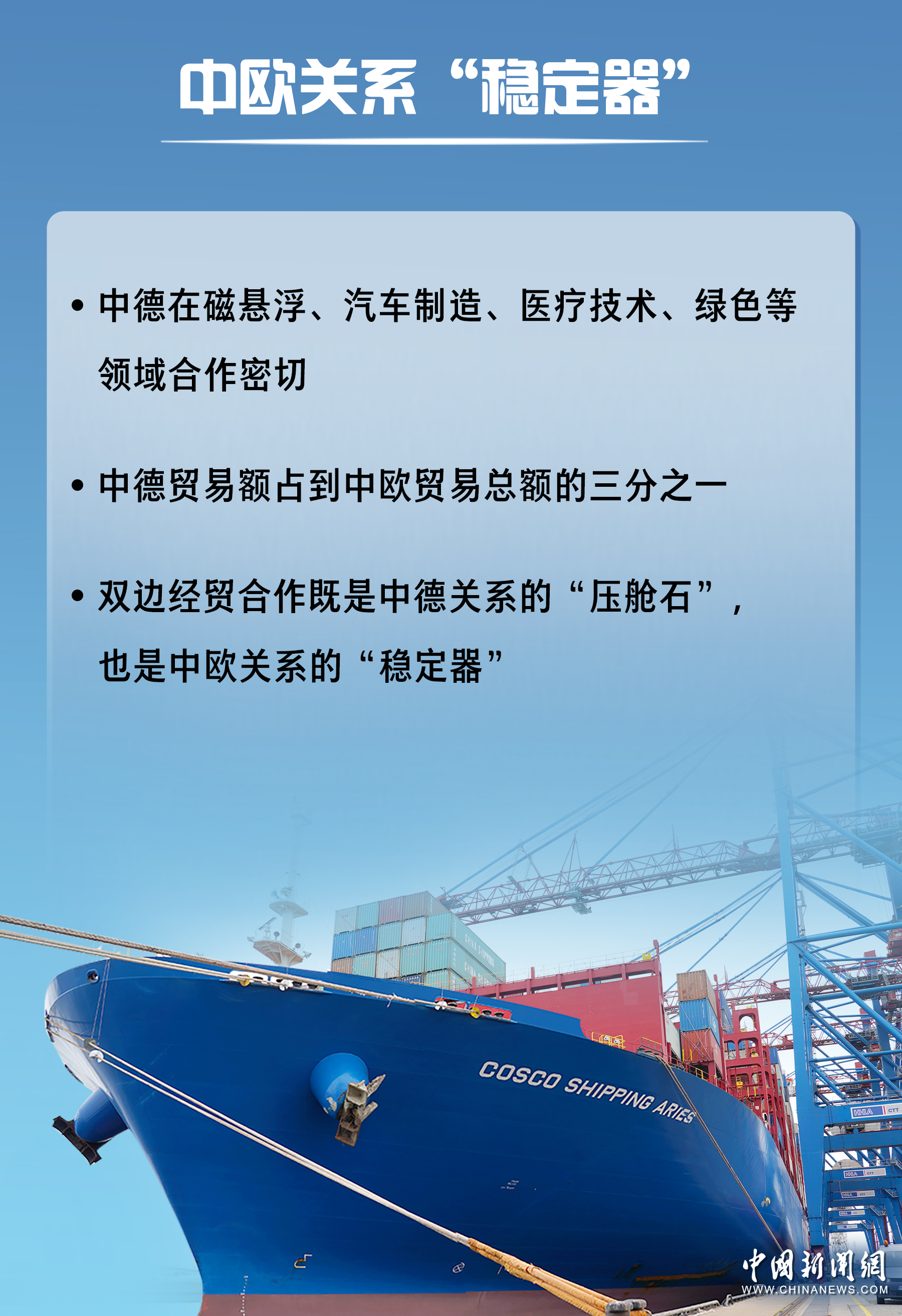 當(dāng)前,中德貿(mào)易額占到中歐貿(mào)易總額的三分之一,德國(guó)對(duì)華投資占到歐盟對(duì)華投資的三分之一,雙邊經(jīng)貿(mào)合作既是中德關(guān)系的“壓艙石”,也是中歐關(guān)系的“穩(wěn)定器”。