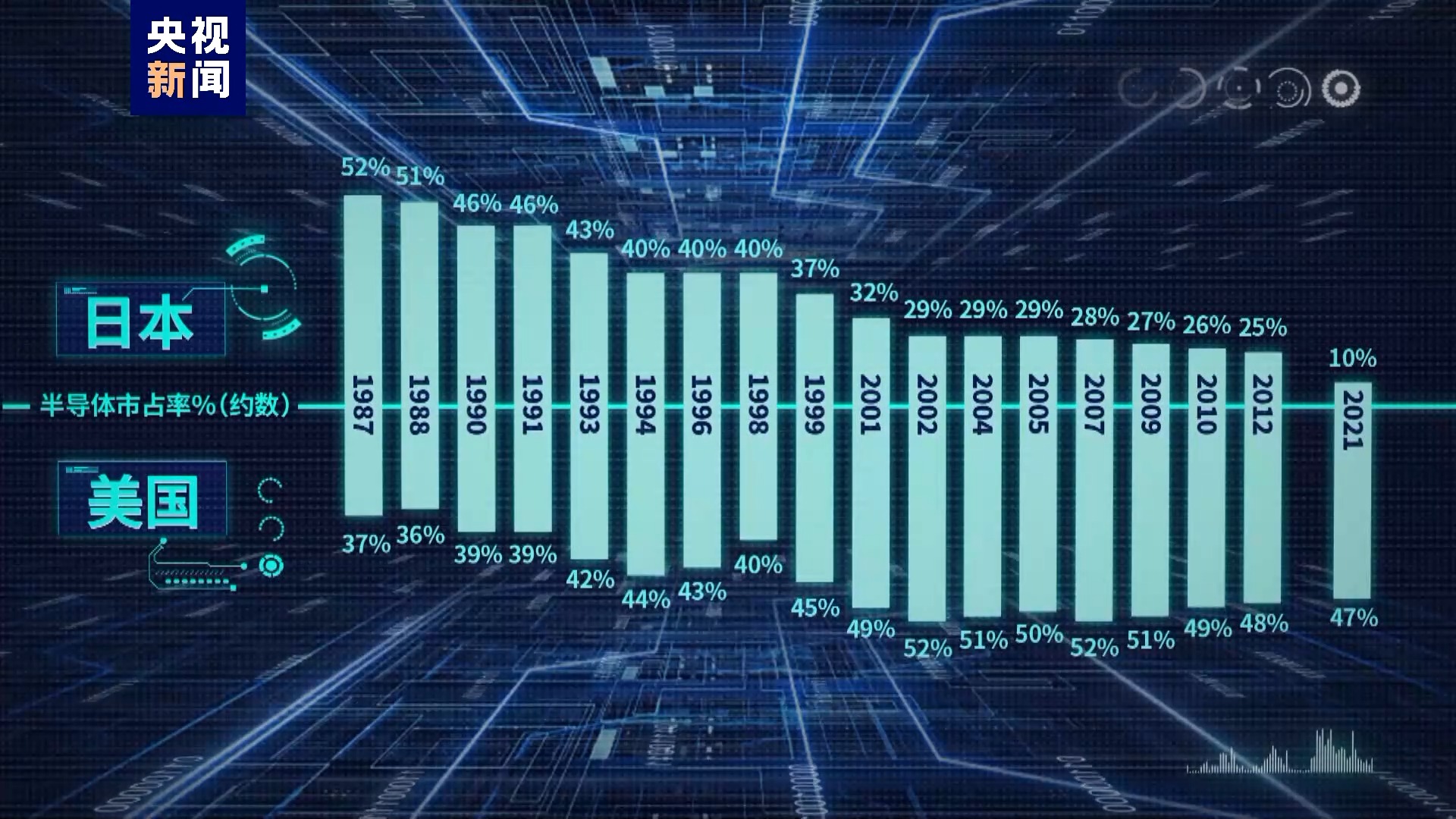 當(dāng)我們在AI數(shù)據(jù)庫中搜索全球半導(dǎo)體產(chǎn)業(yè)的發(fā)展趨勢,系統(tǒng)為我們生成了這樣一張圖。以1987年為分界線,日本半導(dǎo)體產(chǎn)業(yè)進入消沉的30年,美國卻開始迅速崛起,最終重新實現(xiàn)壟斷。
