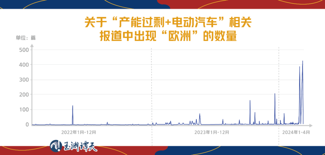 為了拆解美方的敘事套路,我們又定向?qū)λ^中國“產(chǎn)能過剩論”的報道中有關(guān)“新能源汽車”報道的趨勢變化進行了分析。