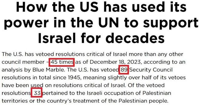 根據(jù)美國智庫"芝加哥全球事務(wù)委員會(huì)"的統(tǒng)計(jì),截至2023年12月18日,美國否決批評(píng)以色列的安理會(huì)決議的次數(shù)比任何其他安理會(huì)成員國都多,為45次。自1945年以來,美國總共否決了89項(xiàng)安理會(huì)決議,這意味著,超半數(shù)的否決權(quán)被用于批評(píng)以色列的決議。而在被否決的決議中,有33項(xiàng)涉及以色列對(duì)巴勒斯坦領(lǐng)土的占領(lǐng)或巴勒斯坦人的待遇問題。