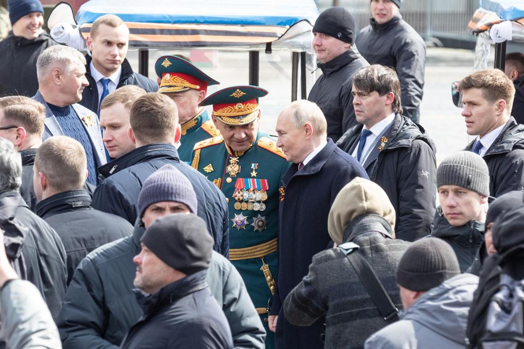5月9日,在俄羅斯首都莫斯科,俄羅斯總統(tǒng)普京在閱兵結(jié)束后與俄羅斯國(guó)防部長(zhǎng)紹伊古交談。新華社記者白雪騏攝
