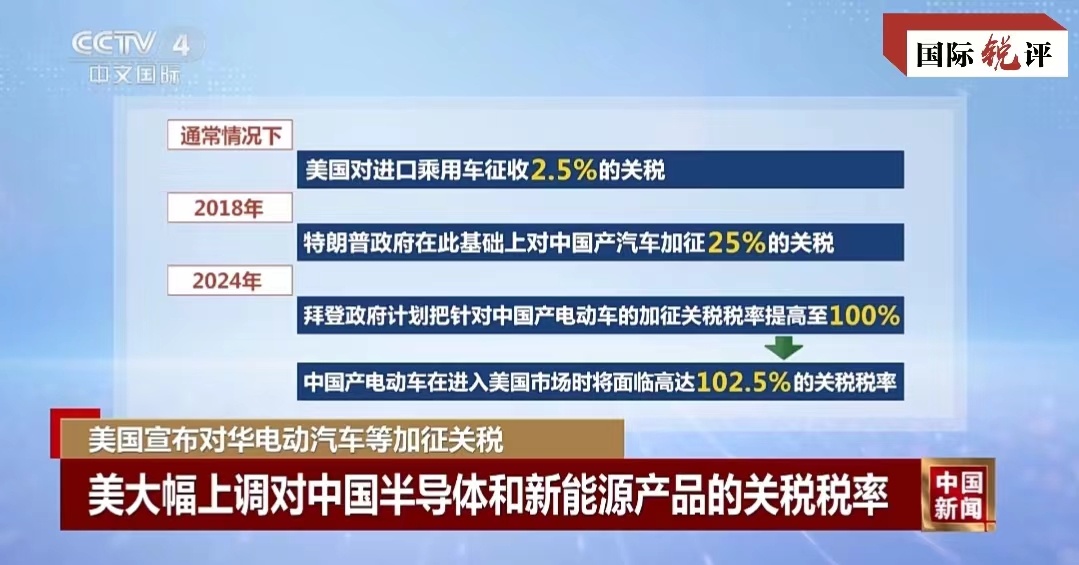 這其中,對(duì)中國(guó)電動(dòng)汽車加征的進(jìn)口關(guān)稅令人瞠目——從27.5%升至102.5%,對(duì)太陽能電池的進(jìn)口稅從25%提高到50%,對(duì)鋰電池的關(guān)稅稅率從7.5%提高到25%。不難看出,美國(guó)政府此次針對(duì)的重點(diǎn)是中國(guó)新能源相關(guān)產(chǎn)業(yè)。難怪美國(guó)多名高官近期密集炒作所謂中國(guó)新能源“產(chǎn)能過?!保贿^是為加征關(guān)稅制造借口。