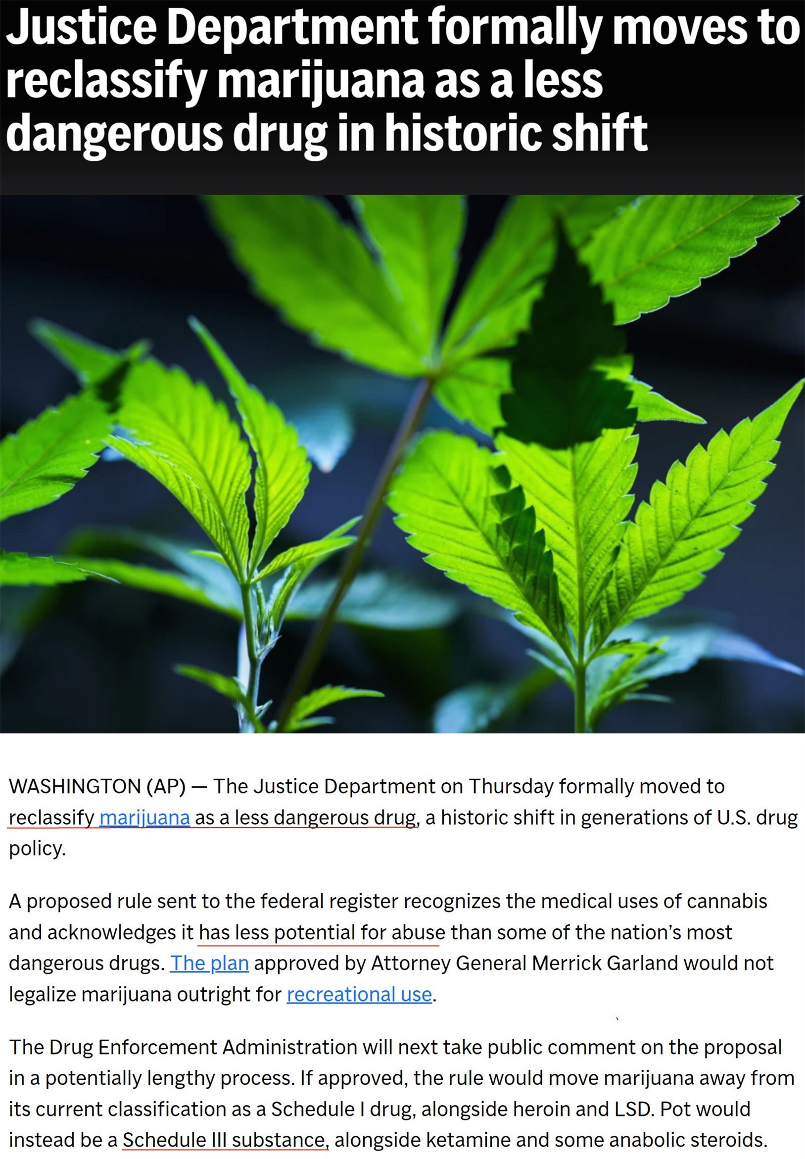 如果經(jīng)過60天的公眾意見征詢期后最終獲批,新規(guī)則雖然不會在聯(lián)邦層面將大麻完全合法化,但會將其移出《美國聯(lián)邦管制物質(zhì)法案》中列管海洛因等最危險(xiǎn)毒品的“附表一”,轉(zhuǎn)而歸入列管氯胺酮和類固醇等危險(xiǎn)性較低藥物的“附表三”。