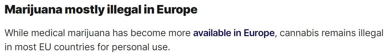 即使在毒品問題同樣嚴(yán)峻的歐洲,雖然醫(yī)用大麻越來越容易獲得,但在大多數(shù)歐盟國家,個(gè)人吸食大麻仍是非法行為。