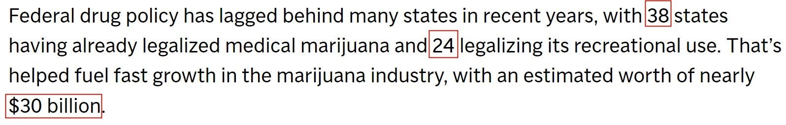 而在美國,目前已有38個(gè)州(37個(gè)州和華盛頓特區(qū))將醫(yī)用大麻合法化,24個(gè)州(23個(gè)州和華盛頓特區(qū))將娛樂性大麻合法化。