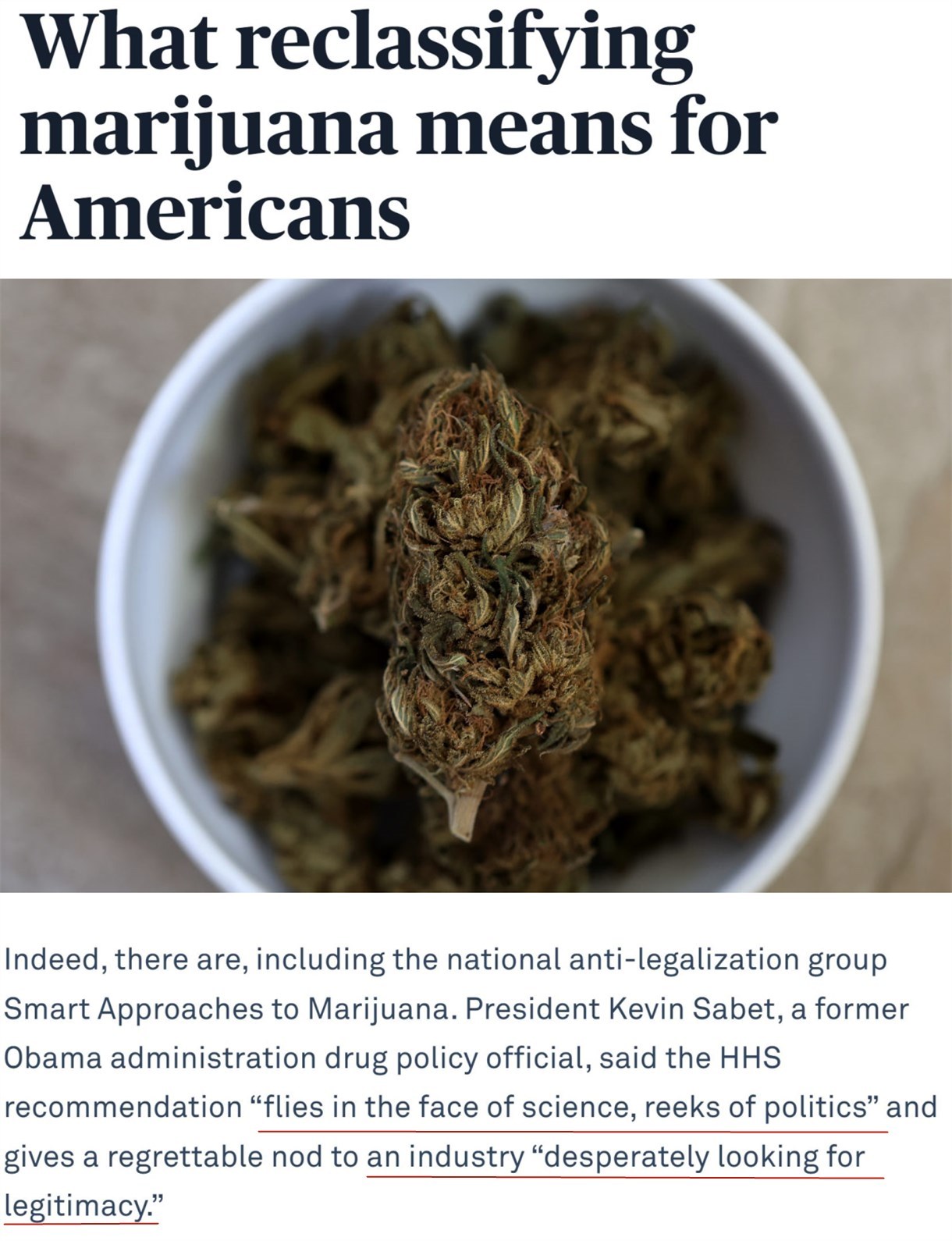 前白宮毒品政策官員凱文·薩比特批評稱,此舉“公然藐視科學(xué),帶有政治意味”,等于是承認(rèn)了一個(gè)“拼命尋求合法性”的行業(yè)。
