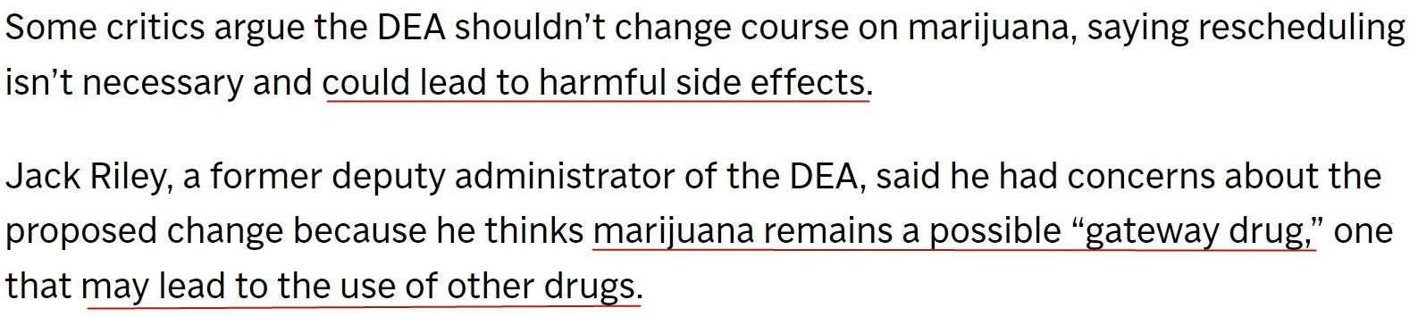 美國禁毒署前副署長杰克·萊利對擬議中的規(guī)則更改感到擔(dān)憂。他認(rèn)為,大麻仍是一種“入門毒品”,可能導(dǎo)致對其他毒品的使用。