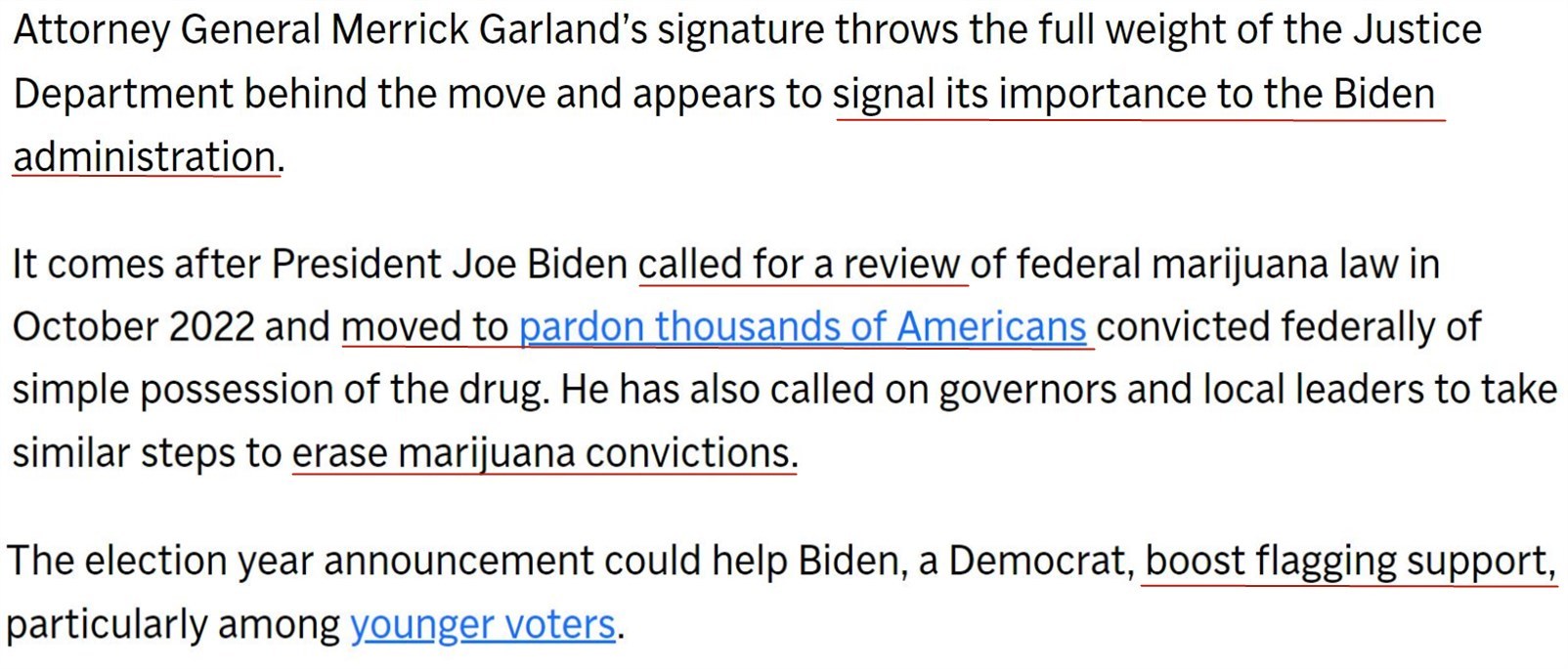 早在2022年,拜登就要求美衛(wèi)生與公眾服務(wù)部和司法部重新審查聯(lián)邦禁毒署對大麻的分類,并隨后赦免了數(shù)千名因持有大麻而被聯(lián)邦定罪的美國人。