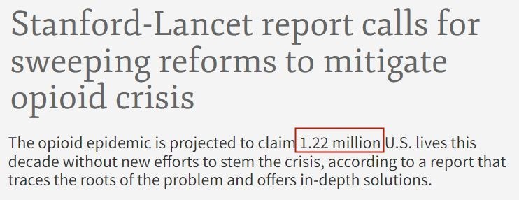 根據(jù)美國斯坦福大學(xué)和英國《柳葉刀》雜志共同進(jìn)行的一項(xiàng)研究,如果美國不采取遏制措施,本世紀(jì)20年代將有約122萬美國人死于過量使用阿片類藥物,位列世界第一。