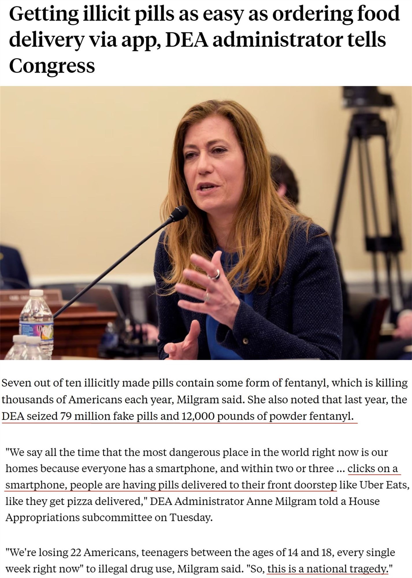 美國禁毒署署長安妮·米爾格拉姆本月早些時(shí)候告訴國會:“現(xiàn)在世界上最危險(xiǎn)的地方就是我們的家,因?yàn)槊總€(gè)人都有智能手機(jī),只要用手指點(diǎn)上兩三下,就能像在外賣平臺點(diǎn)比薩一樣,在家門口收到非法藥丸。”