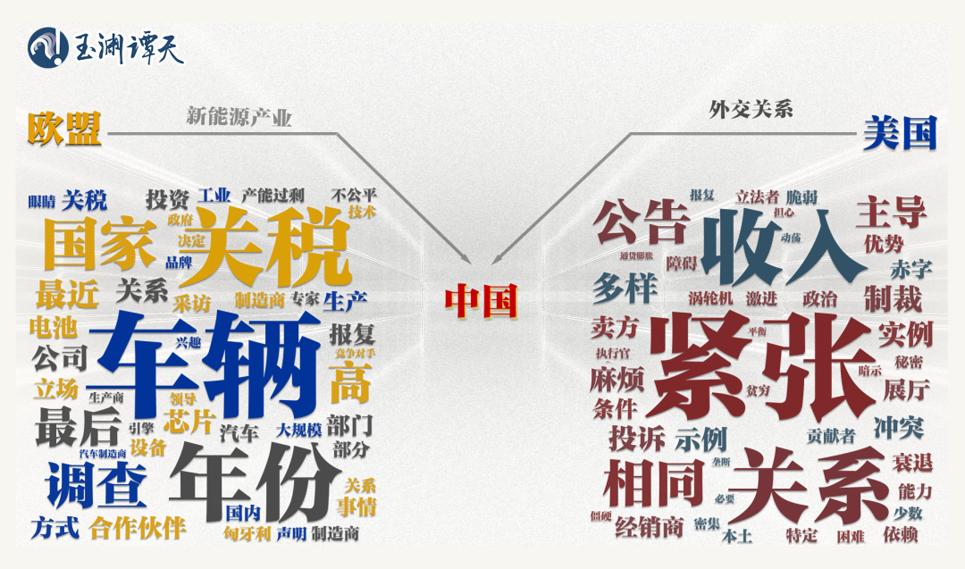 可以看到,以“車輛”“部門”“公司”“制造”等詞為代表的關(guān)鍵詞,都指向了新能源行業(yè)。相比之下,美國(guó)媒體對(duì)同一話題的討論,更側(cè)重“緊張”“關(guān)系”“沖突”“政治”等指向外交關(guān)系的關(guān)鍵詞。