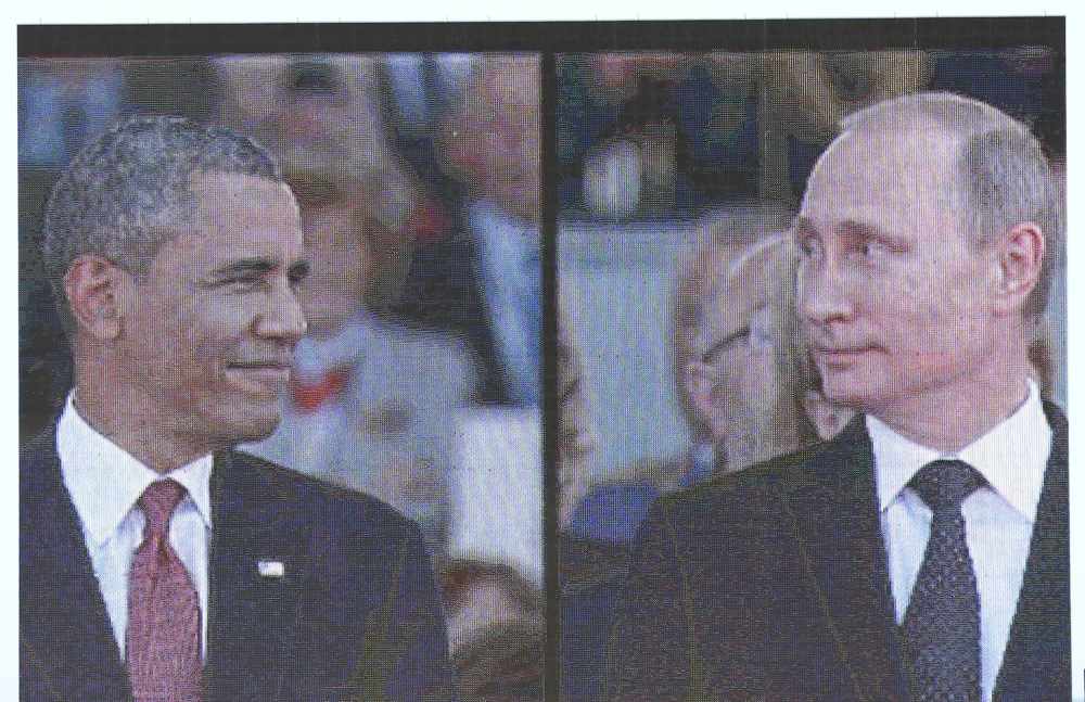 2014年6月6日,在法國諾曼底地區(qū)烏伊斯特勒昂,大屏幕播放前來參加諾曼底登陸70周年紀念儀式的俄羅斯總統(tǒng)普京(右)和美國總統(tǒng)奧巴馬(左)的影像。新華社/路透