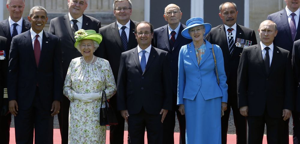 2014年6月6日,在法國貝努維爾,前來參加諾曼底登陸70周年紀念儀式的(前排左起)美國總統(tǒng)奧巴馬、英國女王伊麗莎白二世、法國總統(tǒng)奧朗德、丹麥女王瑪格麗特二世、俄羅斯總統(tǒng)普京等嘉賓合影。新華社/路透