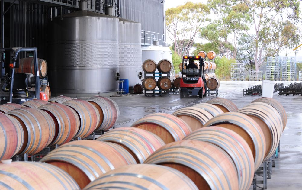 ↑5月30日,在澳大利亞巴羅薩谷,特思納酒莊員工在倉(cāng)庫(kù)搬運(yùn)葡萄酒桶。