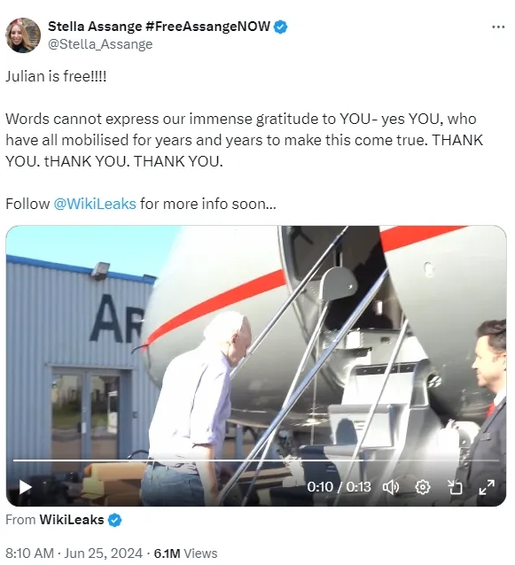 當(dāng)?shù)貢r(shí)間25日,朱利安·阿桑奇的妻子斯特拉在社交媒體上激動(dòng)地寫道,“言語無法表達(dá)我們對(duì)你們的感激之情——是的,就是你們,多年來,你們一直努力讓這一切成為現(xiàn)實(shí)。謝謝你們。謝謝你們,謝謝你們。”