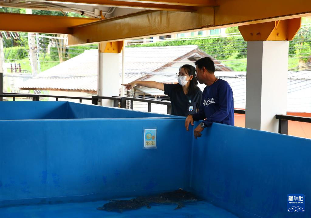 7月23日,在泰國普吉海洋生物中心,工作人員站在被救助的海龜旁。新華社記者 孫瑋彤 攝