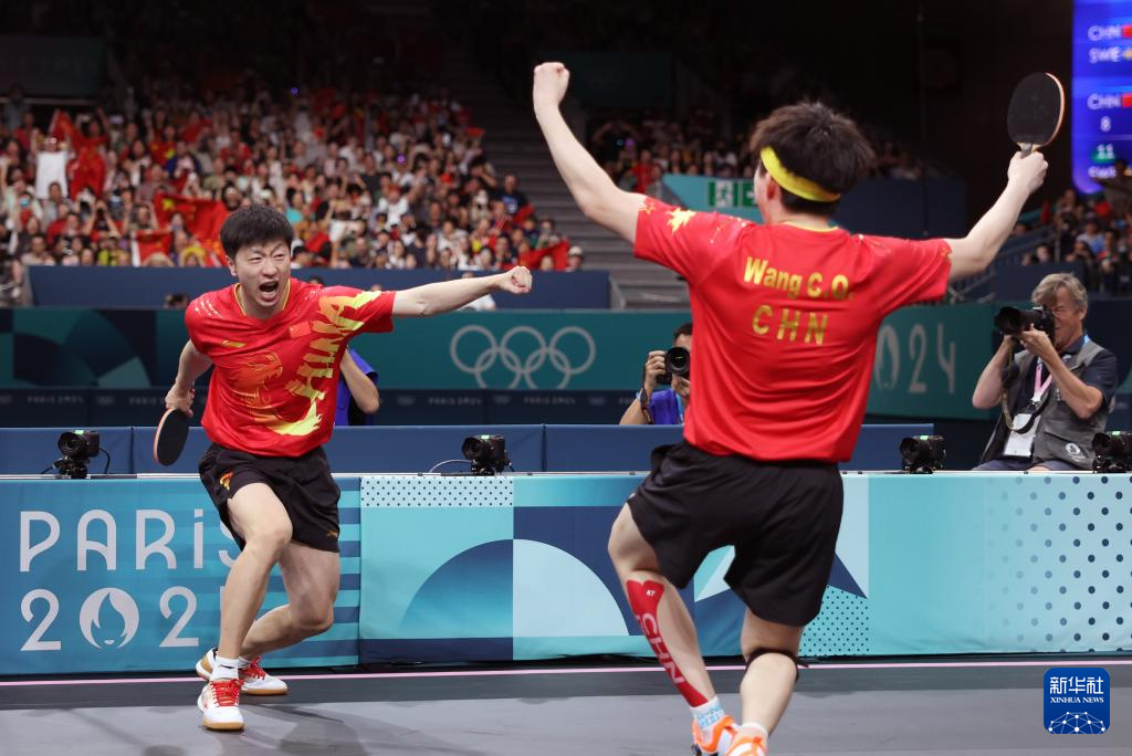 8月9日,中國隊組合馬龍(右)/王楚欽慶祝勝利。新華社記者 盧燁 攝
