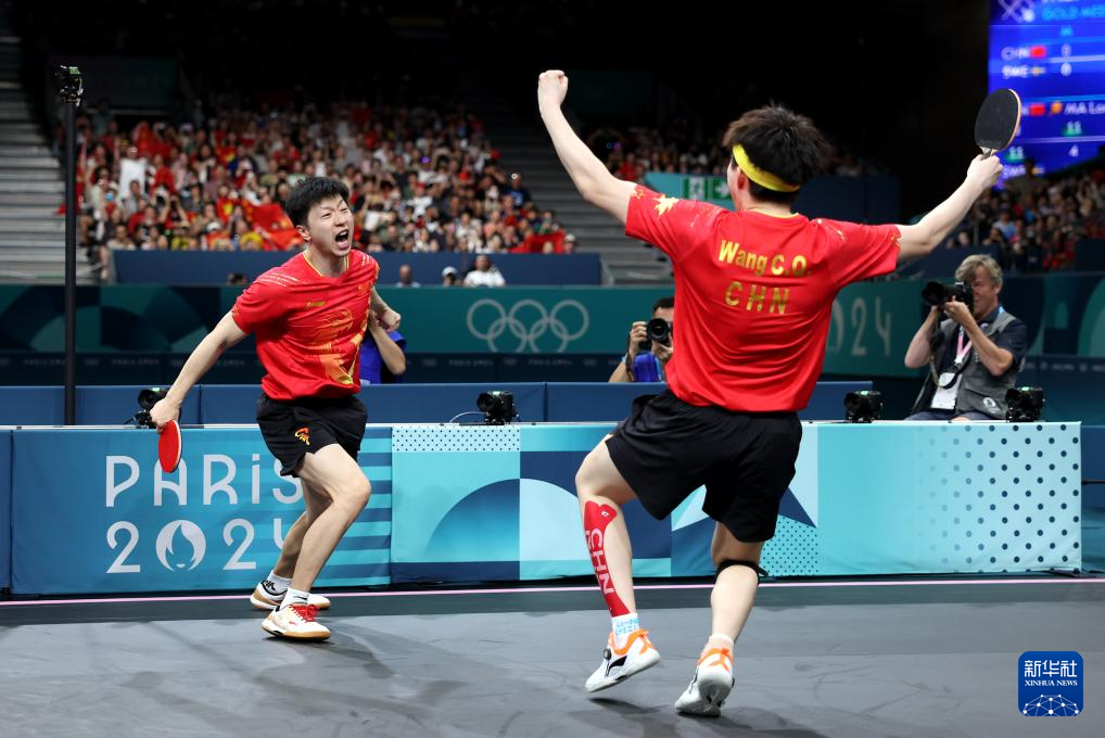 8月9日,中國隊組合馬龍(左)/王楚欽慶祝勝利。新華社記者 劉續(xù) 攝