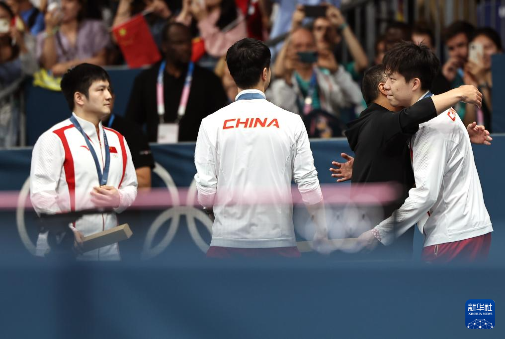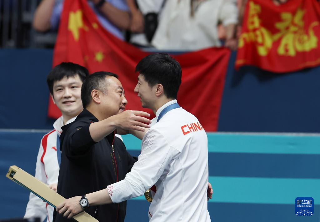 8月9日,中國乒協(xié)主席劉國梁(中)賽后與馬龍(右)擁抱。新華社記者 劉續(xù) 攝