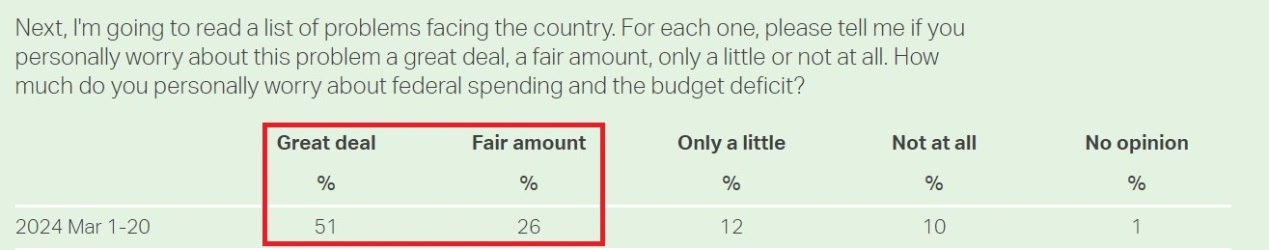 美國(guó)民意調(diào)查機(jī)構(gòu)蓋洛普公司今年進(jìn)行的一份關(guān)于美國(guó)聯(lián)邦債務(wù)的調(diào)查結(jié)果顯示,對(duì)聯(lián)邦債務(wù)問題感到“非常擔(dān)心”和“嚴(yán)重?fù)?dān)心”的受訪者達(dá)到77%。