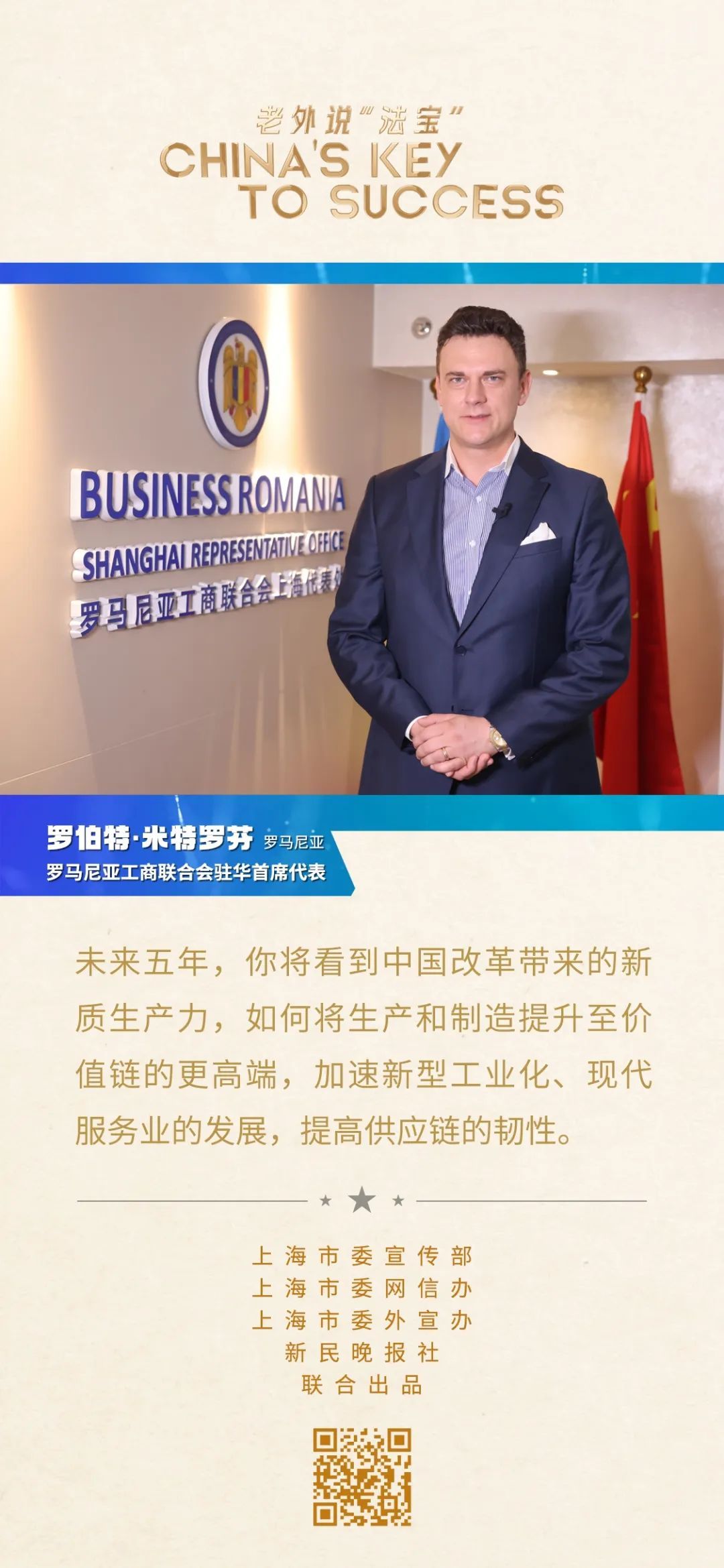 羅伯特·米特羅芬是羅馬尼亞工商聯(lián)合會駐華首席代表。2010年,他以羅馬尼亞國家館工作人員的身份來滬參加上海世博會,那次的旅程讓他深深愛上了這座城市。從那時起,他就在上海定居。