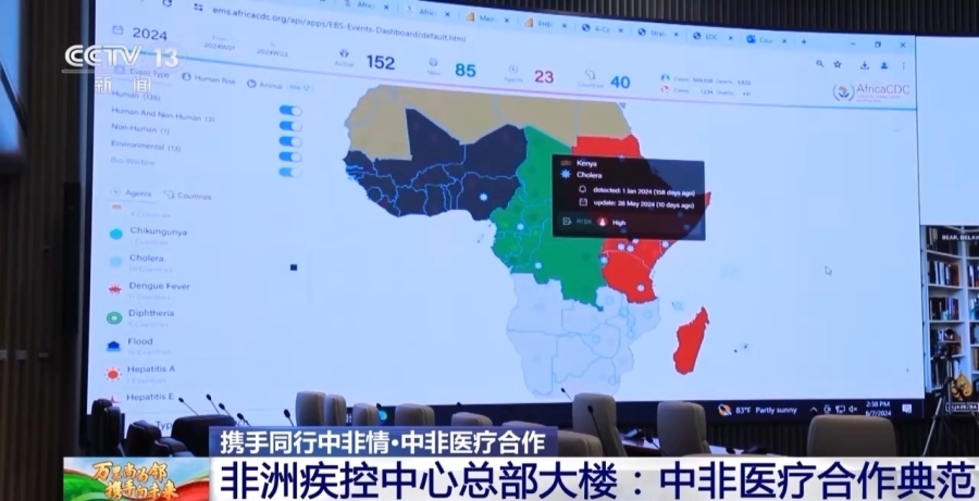在位于非洲疾控中心八層的應(yīng)急指揮大廳里,巨大的顯示屏顯示著新型冠狀病毒、猴痘、埃博拉、登革熱等傳染病數(shù)據(jù),配套設(shè)置有數(shù)據(jù)采集系統(tǒng),可以讓疾病數(shù)據(jù)第一時(shí)間上傳到應(yīng)急指揮大廳,確保數(shù)據(jù)實(shí)時(shí)更新,為疾控決策提供依據(jù)。