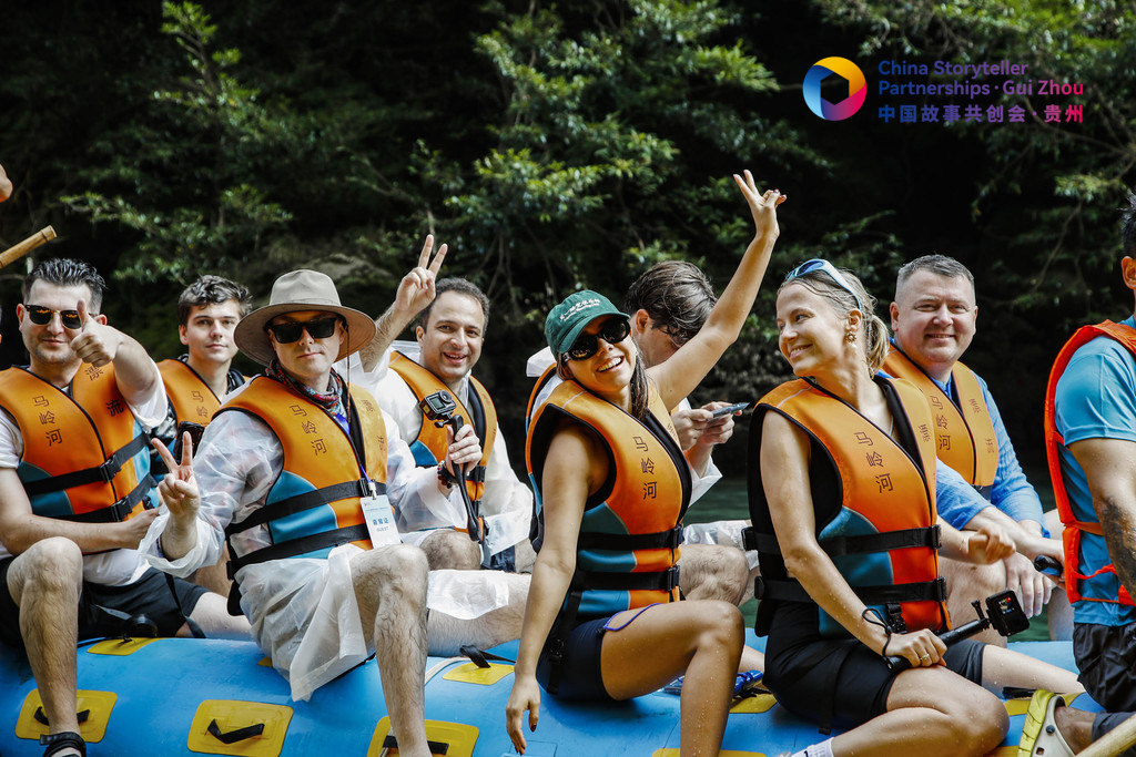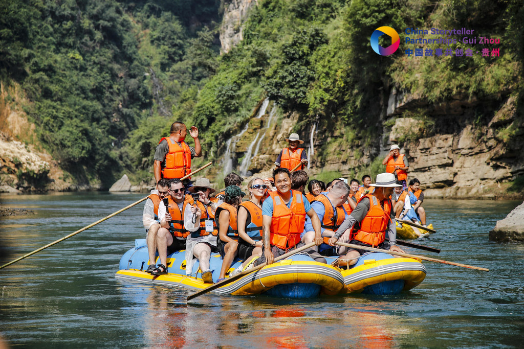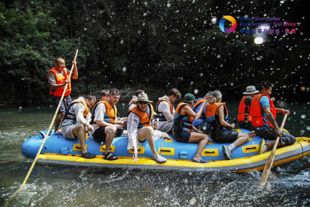 2024中國故事共創(chuàng)會“外籍網(wǎng)紅貴州行”采訪團外籍成員在興義市馬嶺河峽谷體驗漂流。