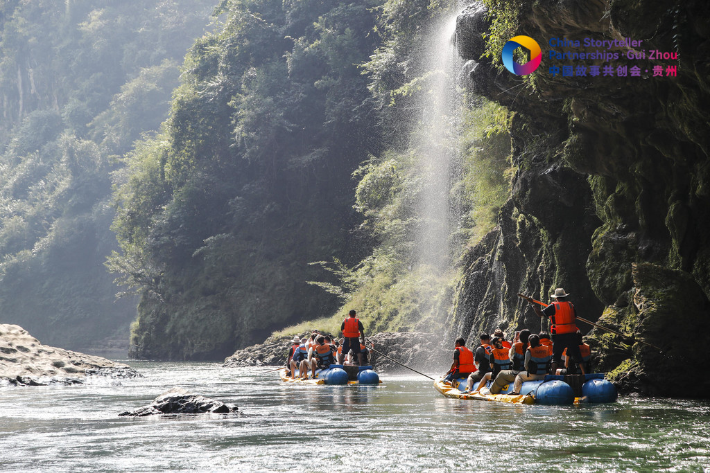 采訪團外籍成員在興義市馬嶺河峽谷體驗漂流戲水,享受清涼時光。