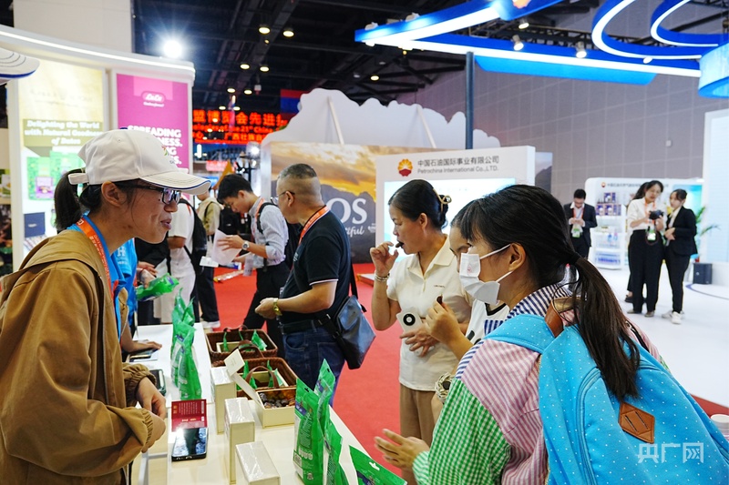 參展觀眾品嘗阿聯(lián)酋特產(chǎn)椰棗(央廣網(wǎng)見習記者 覃亞菲 攝)