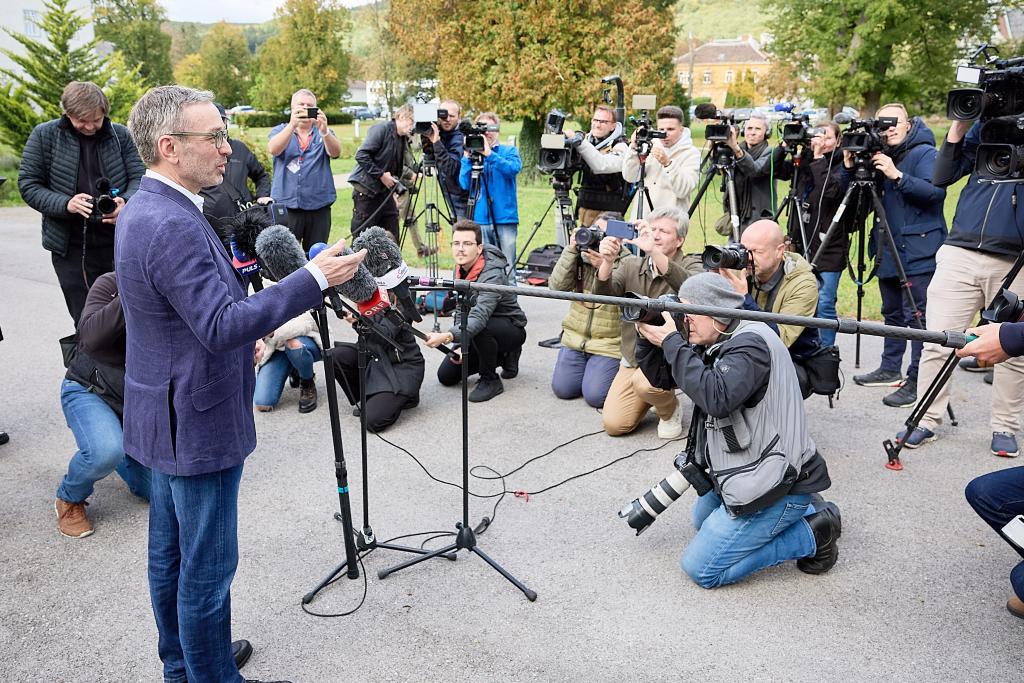 9月29日,奧地利自由黨領(lǐng)袖赫伯特·基克爾在奧地利下奧州的一處投票站投票后接受媒體采訪。新華社發(fā)(喬治斯·施耐德攝)