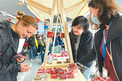 入境游客在上海吳淞口國(guó)際郵輪港到達(dá)大廳設(shè)立的攤位前駐足,了解文創(chuàng)產(chǎn)品。新華社記者 陳愛平攝