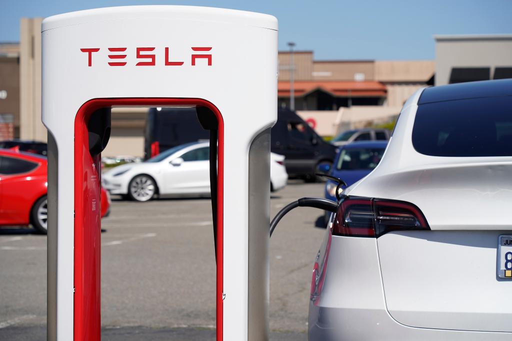 這是4月2日在美國加州圣布魯諾一處停車場拍攝的特斯拉汽車。新華社發(fā)(李建國攝)