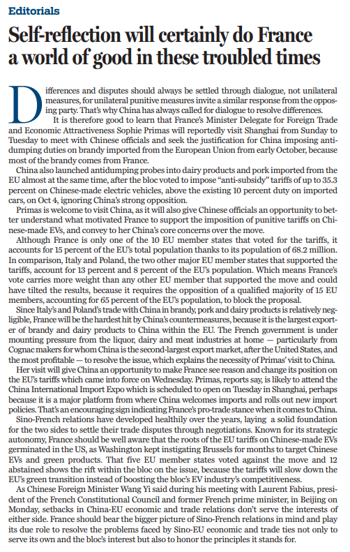 歐盟加征關稅的措施生效之際,普里馬斯的到訪將給中國提供一個說服法國、改變法國的機會。據報,普里馬斯將出席定于11月5日在上海開幕的進博會。進博會以進口為主題,是中國推動高水平開放的平臺。一直以來,法國對華展現出的自由貿易立場,令人鼓舞。